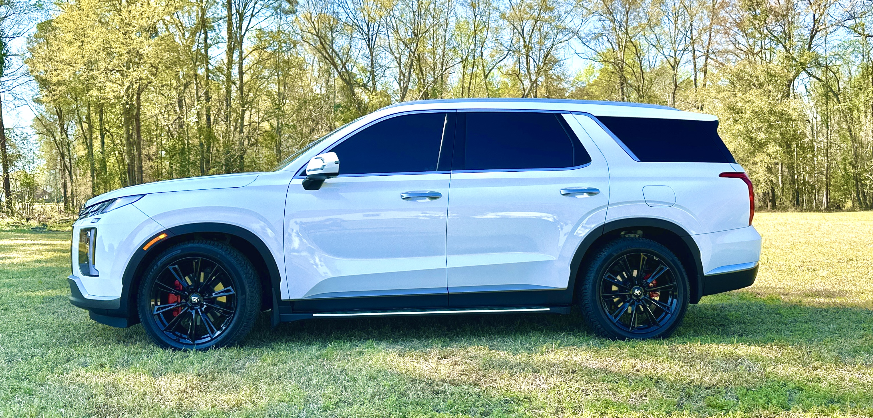 Mjc019cop Mar 26, 2024 2023 Palisade Limited custom exterior with tint, running boards, custom wheels, painted calipers, de-badging, rear wiper delete, and new emblem.